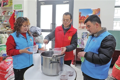 社区工作人员为环卫工人盛腊八粥。地区融媒记者 阿的拉摄