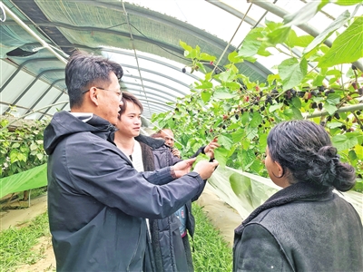 2023年,在村“两委”牵头下,村里从地区蚕科所引进优质桑葚品种,开启反季节鲜果种植试点。面对新品种、新技术,党员主动扛起重任,天不亮便扎根棚内,翻地栽苗、浇水疏果,日复一日精细管护。村干部、驻村工作队员和村民并肩作战,查资料、请专家、学技术,白天记录长势,夜晚交流心得,不分民族、不分你我,携手攻克种植难题。当年试种成功、顺利挂果,为全村发展吃下“定心丸”,更让各族群众拧成一股绳、聚成一条心。